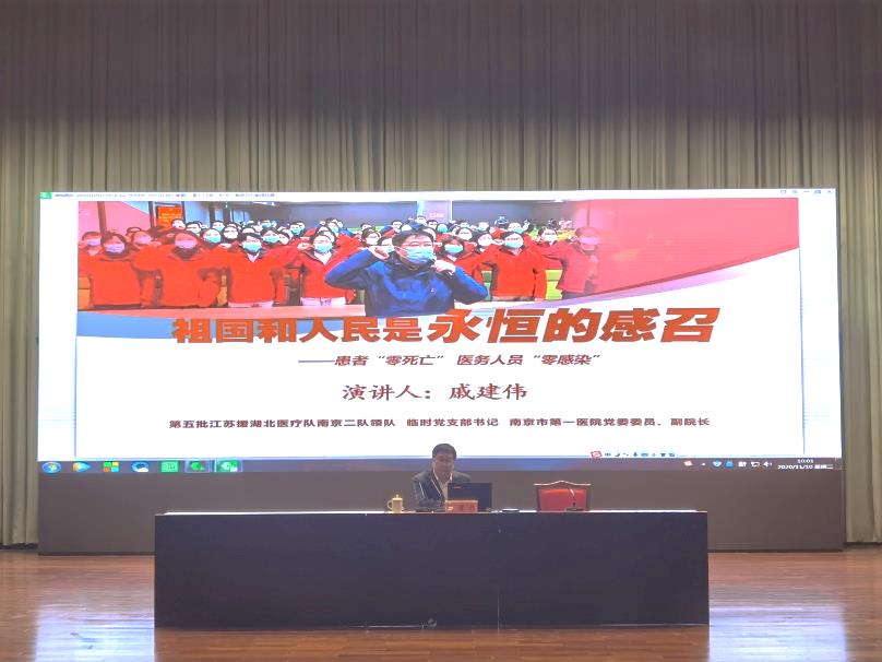 江苏省第五批援湖北医疗队南京二队队长、南京市第一医院副院长戚建伟,以“祖国和人民是永恒的感召”为主题,深情讲述了白衣战士们临危不惧、抢治病患,实现患者“零死亡”、医护人员“零感染”的抗疫事迹。