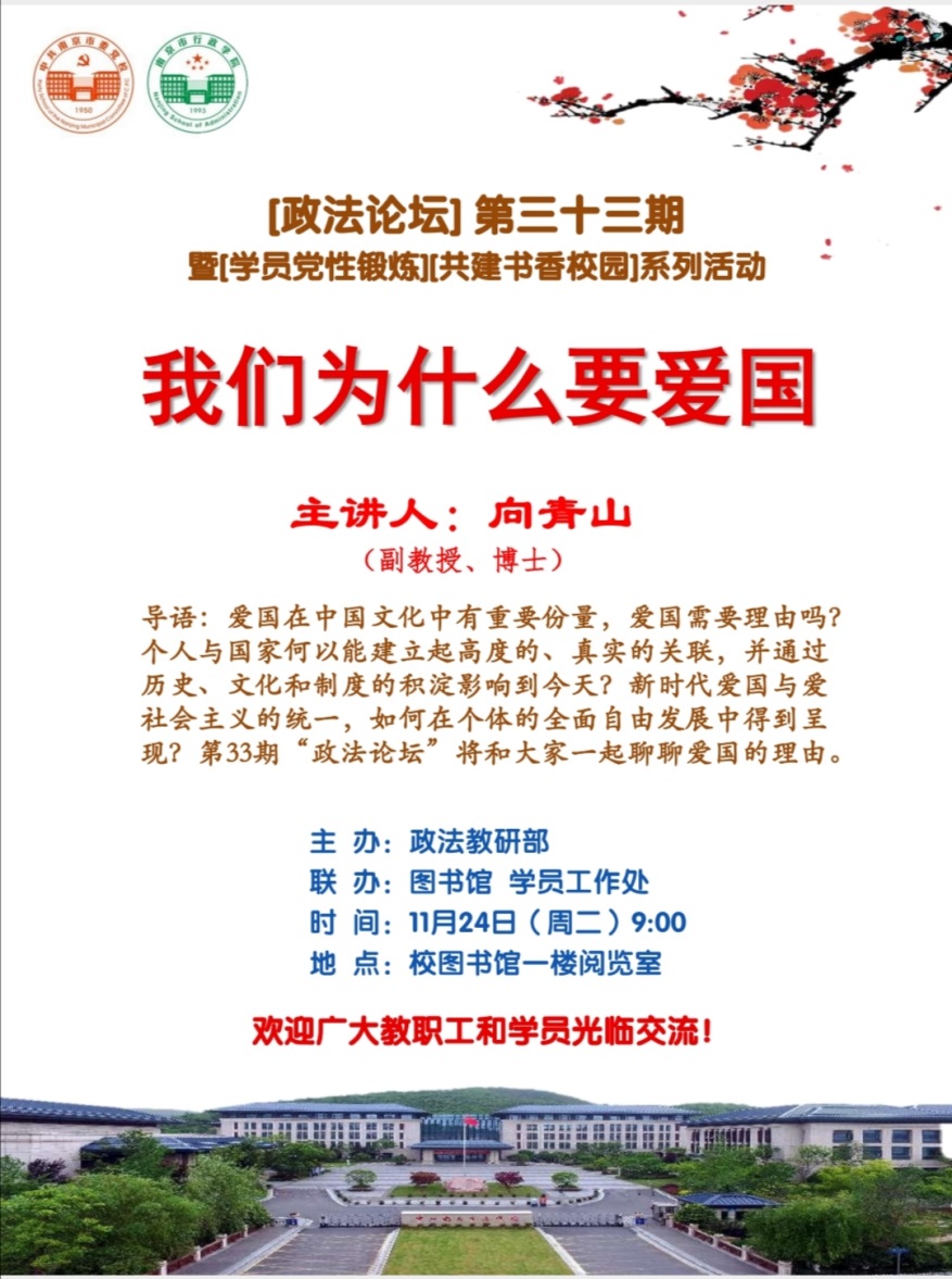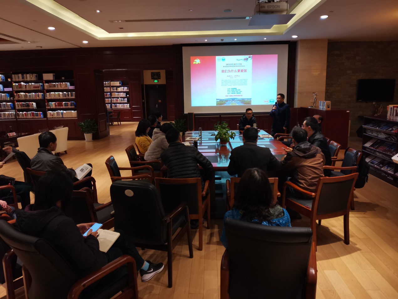 11月24日上午,我校第三十三期“政法论坛”暨“学员党性锻炼”、“4.23世界读书日 共建书香校园”系列活动在图书馆阅览室举办。本次论坛主题“我们为什么要爱国”,由政法教研部副主任、副教授向青山主讲,政法教研部博士张放主持。校领导张树荣、周小兵,部分行政人员和教师近20人参加了论坛。