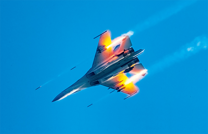 空军某基地紧贴实战组织官兵开展多课目实战化训练。图为战机对地面目标实施攻击。 解放军画报供图 徐晨桐/摄