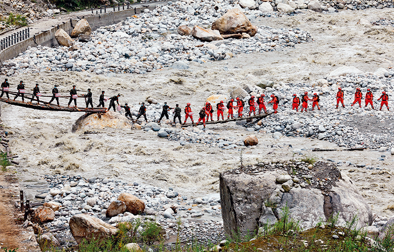 2022年9月5日,四川甘孜藏族自治州泸定县发生6.8级地震,解放军和武警部队官兵、民兵预备役人员驰援灾区展开救援。图为泸定县磨西镇附近,官兵在临时架设的小桥上向河对岸的村民运送生活物资。 解放军画报供图 沈伯韩/摄