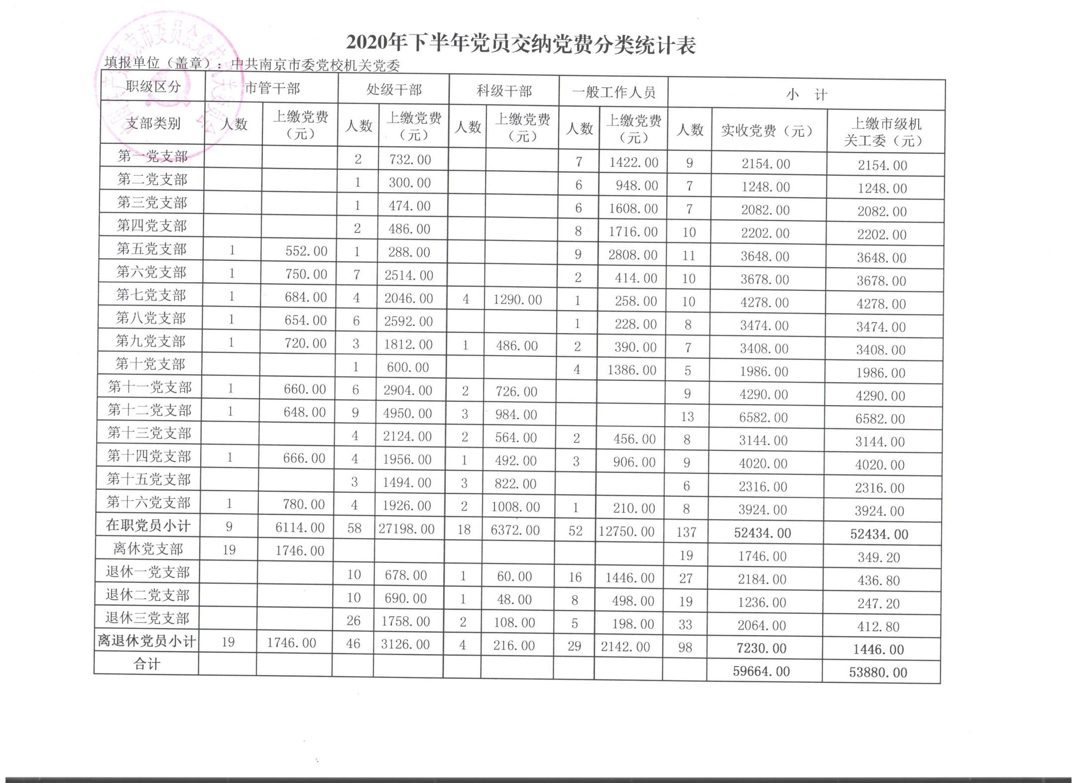 我校院机关党委认真贯彻落实上级文件精神,切实做好党费收缴、使用和管理工作,把党费收缴、使用和管理的情况作为党务公开的一项重要内容,从而进一步加强党员教育,督促党员自觉、足额、按时交纳党费,严格组织纪律性。下半年共收缴党费59664.00元,现根据《校院关于贯彻〈中国共产党党务公开条例(试、行)〉的实施方案》有关精神,将各党支部下半年党费收缴情况公示。