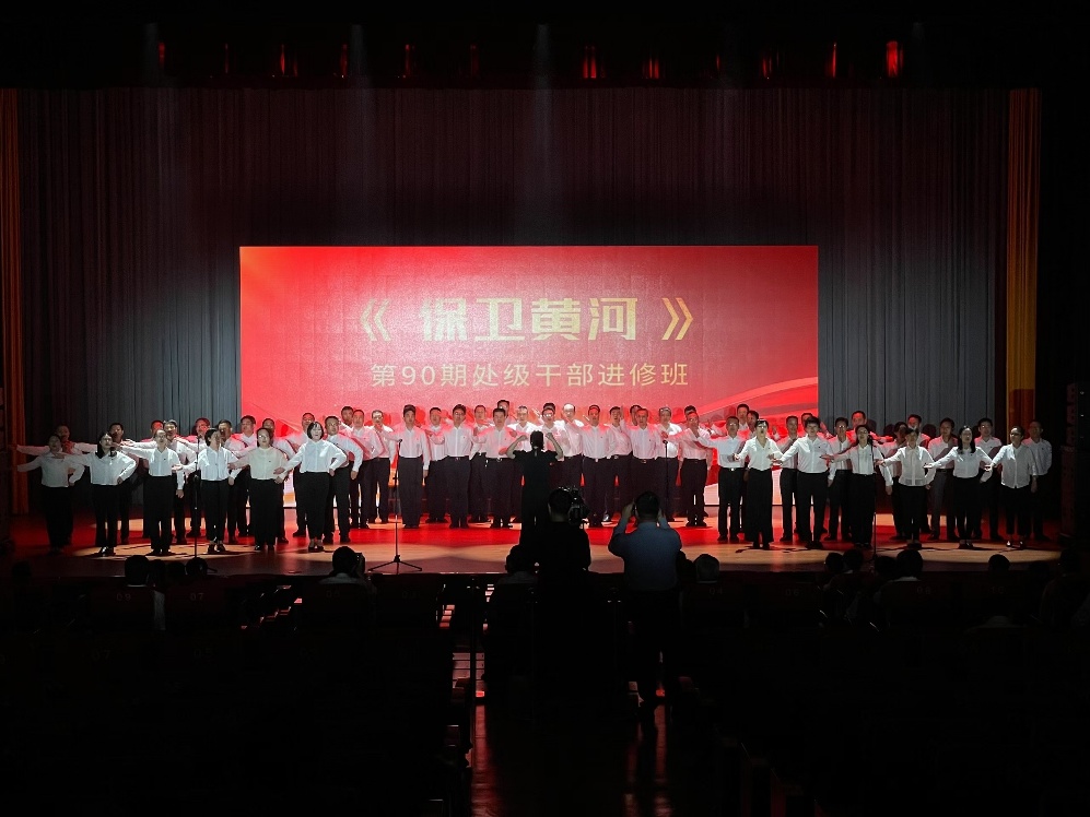 “黄河在咆哮!人民在怒吼!”处级班全体学员以排山倒海之势唱响《保卫黄河》,钢琴伴奏如惊涛拍岸,合唱声浪似民族脊梁挺立于天地间。这首诞生于1939年的抗日战歌,经学员们胸腔共鸣的演绎,每个音符都凝结着中华儿女“保卫家乡、保卫全中国”的铁血誓言。音符起落间,舞台上仿佛浮现出黄河两岸游击队员穿梭青纱帐的身影,台下观众的掌心已沁出热汗——那是历史与现实在音乐中完成的血脉联结。
