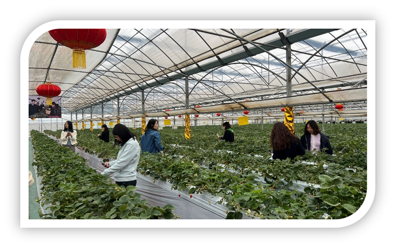 四季春农业园是世业镇农旅融合发展的示范基地,园内温室大棚整齐排列,鲜红的草莓挂满枝头,果香四溢,智能设备有序运转,处处透着现代化农业的生机与活力。学员们走进这里,亲手触摸饱满的果实,观摩高架无土栽培草莓种植,详细了解农旅融合发展模式,看着园区带动村民增收致富的鲜活成果,内心倍受鼓舞,进一步坚定了推动农业现代化、助力乡村振兴的信心与底气。