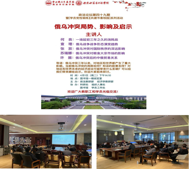 2025年4月1日下午,我校第四十九期“政法论坛”暨“学员党性锻炼”“共建书香校园”系列活动在图书馆一楼阅览室举行。本次论坛主题为“俄乌冲突局势、影响及启示”,由政法教研部和经济学教研部联合主办,何良、查理、张放、苏瑞娜、许振五位老师主讲,政法教研部主任向青山主持。校领导王辉龙、周小兵,部分教师、行政人员近30人参加了本次论坛。论坛取得了良好效果。