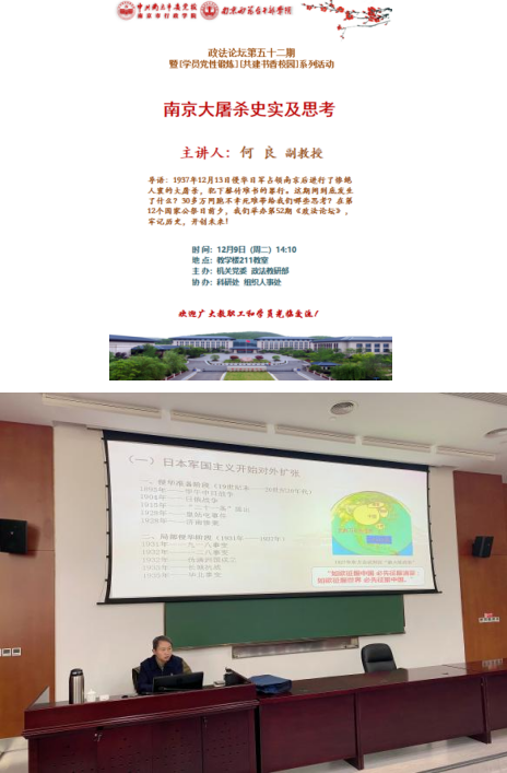 本期政法论坛邀请政法教研部何良副教授主讲“南京大屠杀史实及思考”。他从“背景:南京大屠杀之前发生了什么”“经过:日军侵占南京后存在哪些暴行”“启示:对这一事件的处理、态度及思考”三个方面详细讲授了南京大屠杀的相关史实及引发的思考。整场讲授主题鲜明、逻辑清晰,史料详实、发人深省,有助于我们永远铭记南京大屠杀那段沉痛的历史,用实际行动更好坚守党校初心、矢志民族复兴。