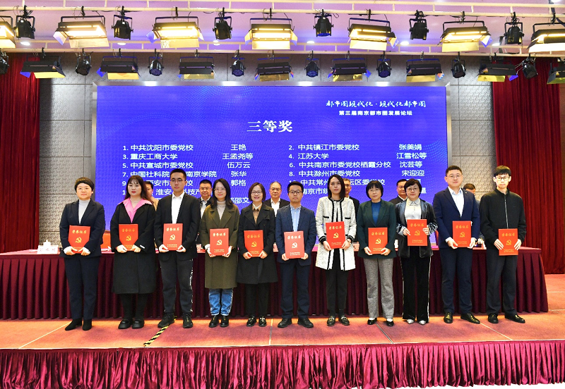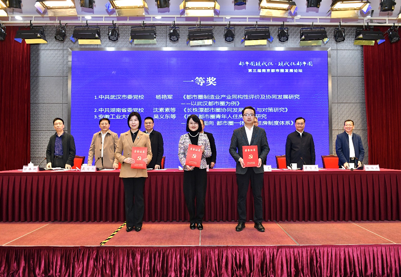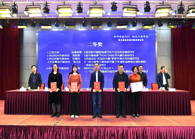本届论坛还启动了全国性的主题征稿活动,甄选出了69篇论文集结成册——《南京都市圈发展论坛(第三届)论文集》,并评选出一等奖3篇、二等奖5篇、三等奖12篇。现场,南京市发改委副主任、二级巡视员、南京都市圈建设办公室专职副主任祝瑞波宣读获奖名单,与会主要领导为获奖者代表颁奖。
